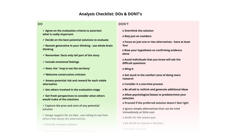 Adopt a holistic approach to evaluate your ideas and work systematically in finding solutions to your problems with Chris Griffiths’ Analysis Checklist template.