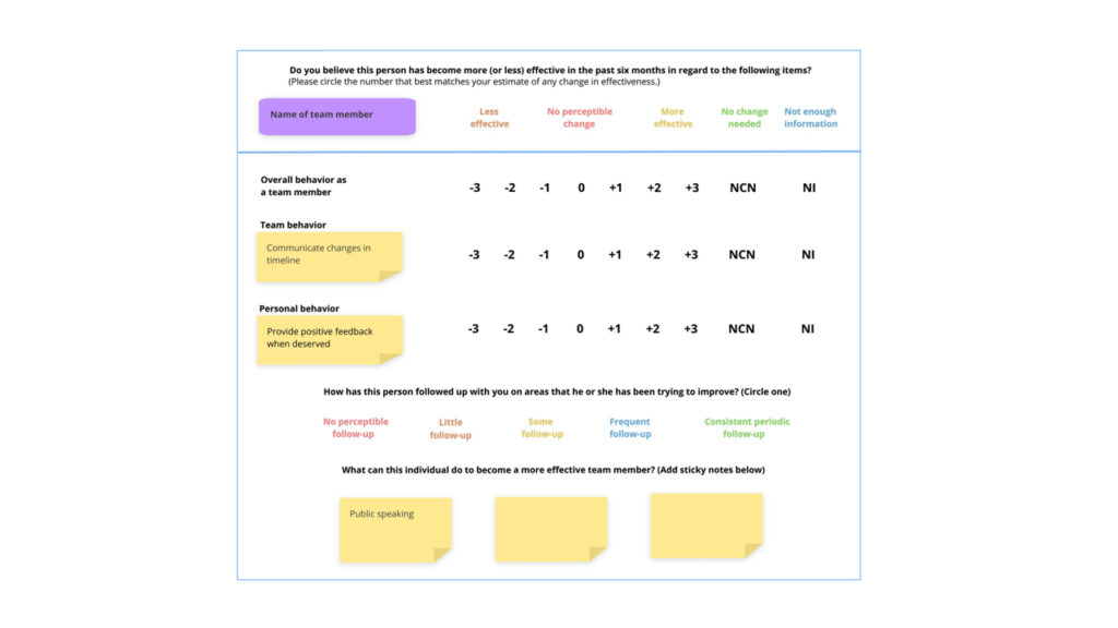 After identifying areas for improvement and implementing necessary changes, gather feedback on each team members’ perceived change in effectiveness with Marshall Goldsmith’s Team Building Without Time Wasting Follow Up Survey template.