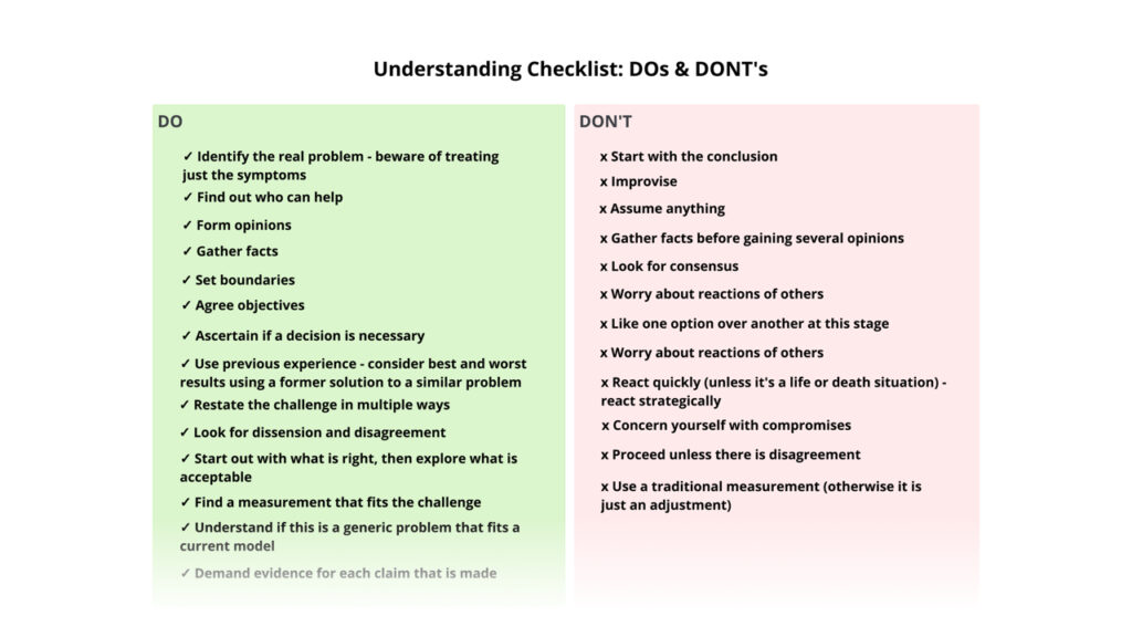 Focus your mind on the considerations which are crucially relevant to you when defining a problem with Chris Griffiths’ Understanding Checklist template.